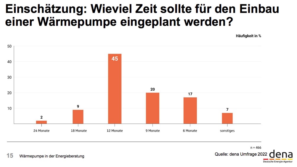Die Nachfrage nach Wärmepumpen ist in den letzten Monaten sprunghaft gestiegen. Wie aus einer Befragung der Deutschen Energie-Agentur (Dena) unter 10.000 Energieeffizienzexpertinnen und -experten hervorgeht, sind die Wartezeiten auf die Systeme derzeit lang. 45 Prozent der Energieberater berichten von Wartezeiten bis zu einem Jahr.