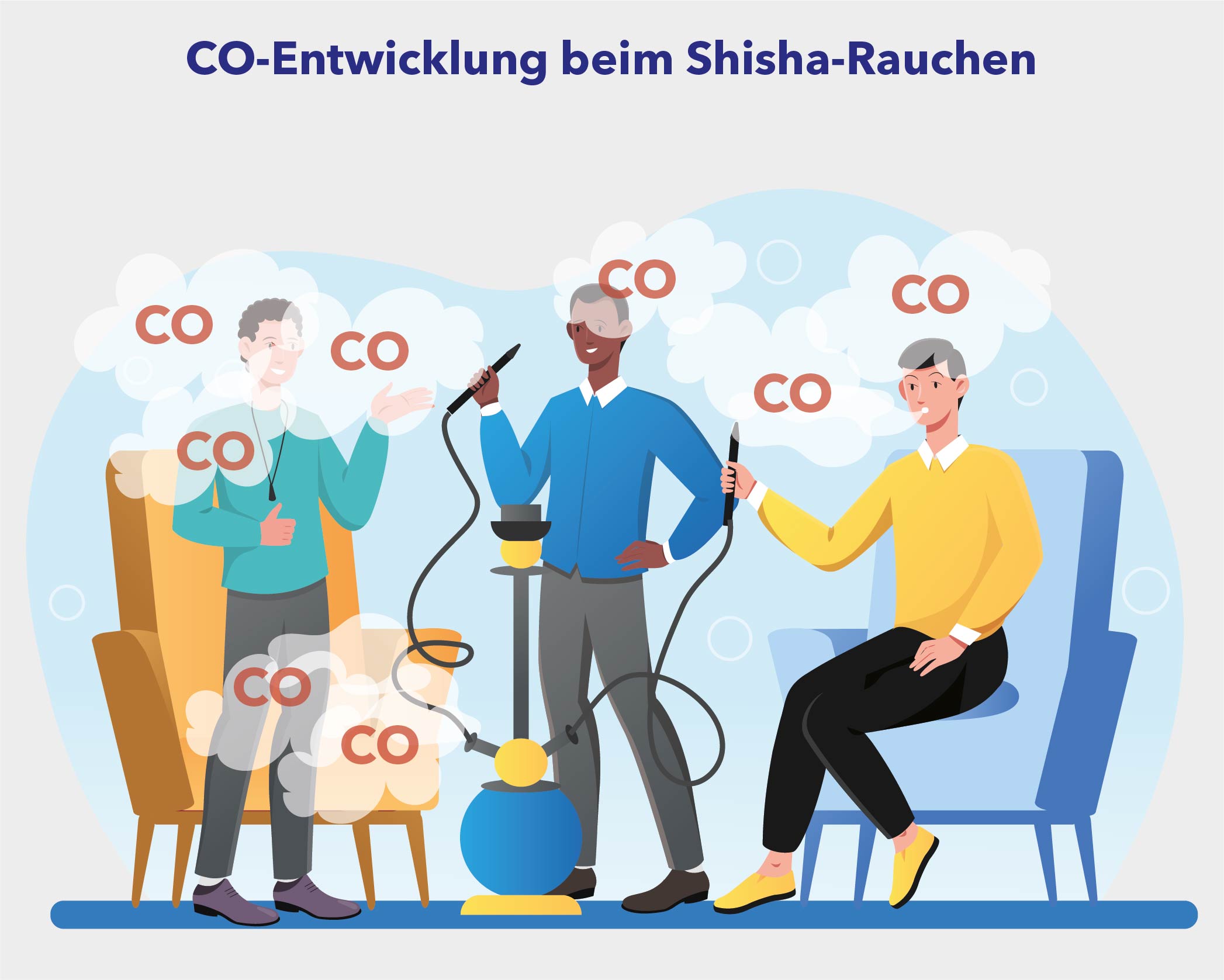 Wird die Shisha traditionell mit Kohle betrieben, entsteht Kohlenstoffmonoxid (auch Kohlenmonoxid genannt oder in chemischer Kurzform CO) im Zuge des Verbrennungsprozesses. Werden Shishas in Innenräumen geraucht, können sich bei schlechter Raumbelüftung hohe CO-Konzentrationen aufbauen.