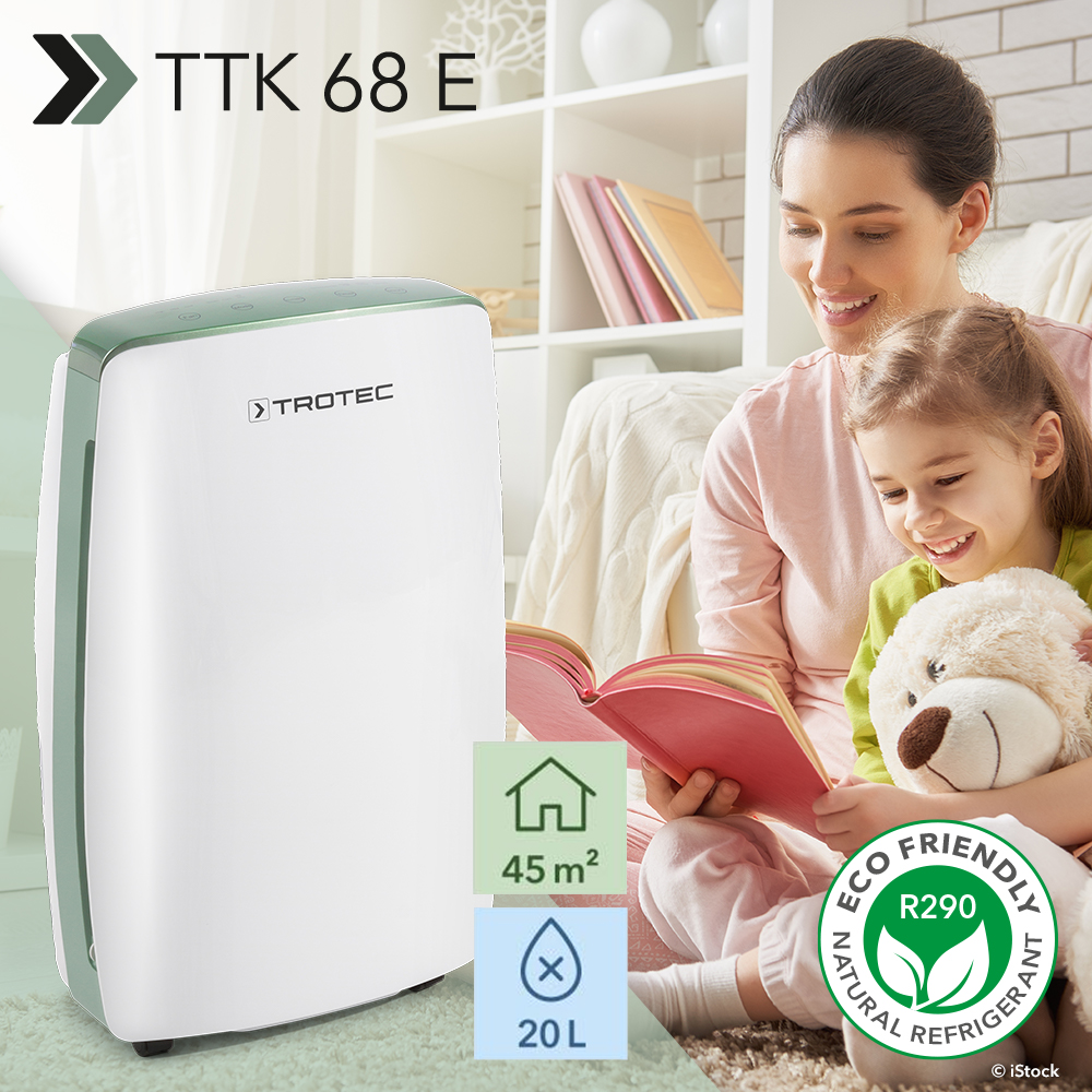 Ganz klar, mit Ihrer richtigen Wahl des Komfort-Luftentfeuchters TTK 68 E setzen Sie nicht nur in Ihren eigenen vier Wänden augenfällige Akzente, sondern sorgen auch ganzjährig für eine optimale Luftfeuchtigkeit sowie ein gesundes Wohlfühlklima. Denn der Luftentfeuchter überzeugt neben seiner Leistungsstärke – mit bis zu 20 l/Tag entfeuchtet er mühelos Räume bis 45 m² – schon beim ersten Einschalten durch seine luxuriöse Vollausstattung. Und zum gewohnt günstigen Preis der Trotec-Markenqualität gibt’s noch einiges mehr oben drauf …