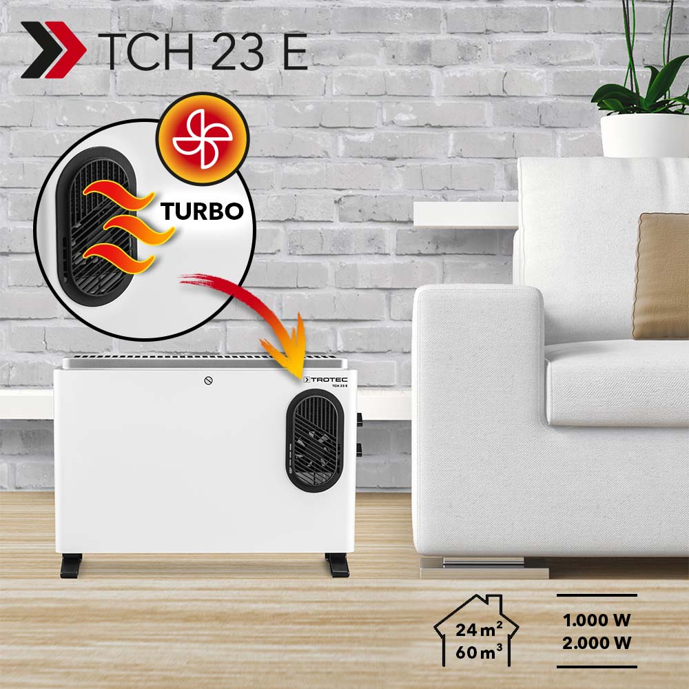 Dank seiner zweistufigen Heizleistung mit wählbaren 1.000 oder 2.000 Watt ermöglicht der Konvektor TCH 23 E die schnelle Temperierung von Räumen bis zu einer Größe von 24 m² bzw. 60 m³ – beispielsweise als Zusatzheizer in Wohn- oder Schlafzimmern oder als Schnellheizer zur Erwärmung von Hobbyräumen, Wintergärten, Werkstätten, Garagen sowie Kellerräumen. Und wenn es turboschnell warm werden soll, schalten Sie einfach das Turbogebläse hinzu. Dabei arbeitet der Konvektor praktisch und energiesparend mit einer integrierten Thermostatsteuerung, mit der die Innenraumtemperatur vollautomatisch auf den gewünschten Zielwert reguliert wird.