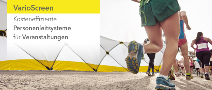 Wo immer Sie auch eine großflächige Absperrung oder Wegeführung benötigen, VarioScreen richtet sich nach Ihren Anforderungen: als Absperrung für geschlossene oder eintrittspflichtige Bereiche. Oder um die Besucher mittels eines Ganges zum Kassen- oder Toilettenbereich einer Veranstaltung zu führen. Auch nicht öffentliche Bereiche einer Veranstaltung werden mit VarioScreen-Wänden optisch ansprechend abgeschirmt.