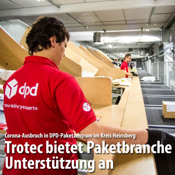 „Wir arbeiten seit vielen Jahren sehr erfolgreich mit DPD zusammen und versenden nahezu 90 % unserer Sendungen über das betroffene Paketzentrum. Die Nachricht über den Corona-Ausbruch trifft uns natürlich auch. Jetzt ist der richtige Moment, um uns für die jahrelang sehr professionelle Zusammenarbeit zu bedanken und das Unternehmen dabei schnell und unkonventionell zu unterstützen, das Paketzentrum wieder maximal sicher für alle Mitarbeiter zu gestalten.“, so Marcus Probos, Leiter Logistik der Trotec GmbH.