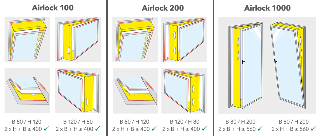 Liegt die Summe unter oder entspricht 400 cm bzw. 560 cm, dann eignen sich der AirLock 100 oder 200 bzw. der AirLock 1000 hervorragend für Ihren individuellen Abdichtungseinsatz.