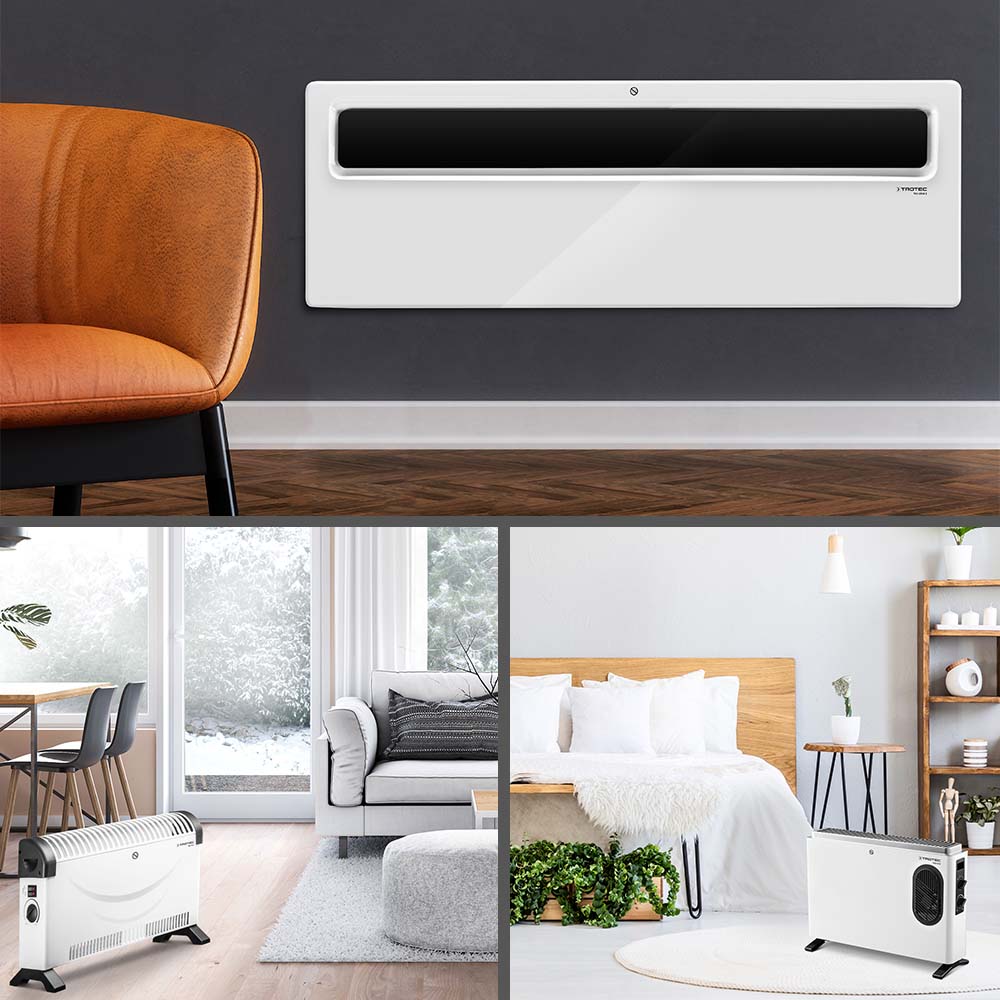 Heiztechnik: Konvektorheizgeräte von Trotec sind mit und ohne Ventilator erhältlich. Die kühle Raumluft wird an den innenliegenden Heizflächen erwärmt und steigt aufgrund natürlicher Konvektion geräuschlos nach oben auf und verteilt sich im Raum. Geräte wie die Design-Konvektoren TCH 2310 E und TCH 2311 E verfügen zusätzlich über ein zuschaltbares Turbogebläse zur beschleunigten Luftumwälzung und Warmluftverteilung.