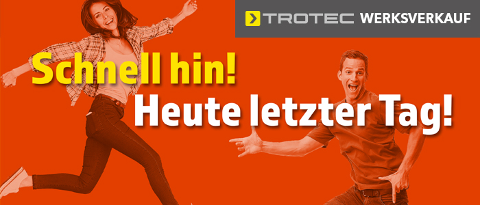 Wer heute noch schnell ein paar Schnäppchen ergattern will, sollte von 8 bis 17 Uhr beim Trotec Werksverkauf herein schauen.