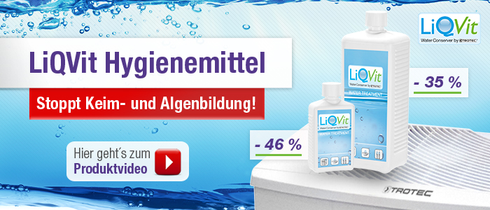 Das nur exklusiv bei Trotec zu erhaltene, innovative Wasserhygienemittel LiQVit stellen wir jetzt in einem eigenen Produktvideo vor. LiQVit sorgt für hygienisch einwandfreies Verdunstungswasser im Luftbefeuchter. Darüber hinaus vermindert das Mittel die Oberflächenspannung des Wassers, was die Verdunstungsleistung steigert. Durch die zusätzliche Reduzierung mineralischer Ablagerungen kann außerdem die Standzeit des Verdunstungsfilters verlängert werden.