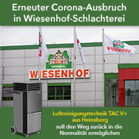 Daher verwundert das erneute Infektionsgeschehen in einem Wiesenhof-Schlachtbetrieb nicht. 1100 Mitarbeiter auf engstem Raum, hier ist eine Atemluftdurchmischung mit infektiösen Aerosolen unausweichlich. Es herrscht Einigkeit, dass sich das Virus hauptsächlich über die Raumluft verbreitet. Und vor der Einatmung infektiöser Partikel schützen weder Mund-Nasen-Masken, Abstandsregeln noch häufiges Händewaschen oder Desinfektionsmittel.