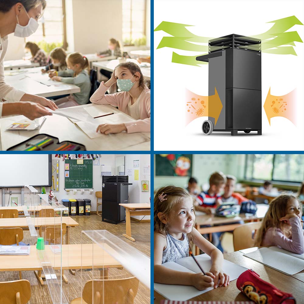 >> Mit den mobilen Raumluftreinigern können sie das indirekte Infektionsrisiko in Schulen nahezu vollständig ausschließen, wenn sie die richtig betreiben. Das direkte Infektionsrisiko können sie mit transparenten Schutzwänden minimieren. <<