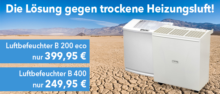 Die Tage werden kürzer, es wird kühler. Da werden die Heizungen angeschaltet, damit es in den Räumen angenehm warm wird. Doch diese trockene Heizungsluft schadet dem Interieur – gerade wenn es sich um teure Bücher und Kunstwerke handelt bedeutet dies oftmals einen großen Schaden! Auch Grippeviren fühlen sich in beheizten, trockenen Räumen besonders wohl. Staub hält sich zudem länger in der Luft. Diesen Schädlingen für Ihre Gesundheit und Ihr Interieur können Sie schnell und mühelos zu Leibe rücken. Auf Knopfdruck – mit einem mobilen Luftbefeuchter von Trotec! Den B 200 eco und den B 400 gibt es jetzt mit sensationellen Rabatten.