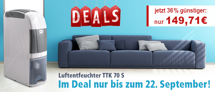 Bei dem tollen Preis-Leistungs-Verhältnis können Sie nichts falsch machen: bestellen Sie jetzt den Luftentfeuchter TTK 70 S und bekommen ihn in der 38. KW direkt zu sich nach Hause geliefert – das Warten lohn sich!
