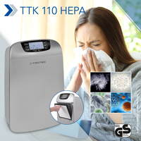 Ebenso breit aufgestellt präsentiert sich der TTK 110 HEPA in seiner zweiten Funktionalität als vollwertiger Luftreiniger: Mit seiner HEPA-Filterfunktion befreit das Multitalent binnen 8 Stunden spürbar die Raumluft von gesundheitsschädlichen Viren, Bakterien und Verunreinigungen. Selbst kleinste Mikropartikel bis zu 0,3 Mikrometer Größe werden von dem HEPA-Schwebstofffilter mit einer Wirksamkeit von 99,97 % absorbiert – Viren und Bakterien haben keine Chance!