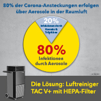Oder mit einem geeigneten Luftreiniger, wie dem Hochfrequenz-Luftreiniger TAC V+ von Trotec, mit dem die Aerosolgemische in der Raumluft unmittelbar verdünnt und danach in einem speziellen HEPA-Virenfilter ausgefiltert und inaktiviert werden. In Krankenhäusern wird diese HEPA-Raumluftfiltertechnik schon länger eingesetzt, beispielsweise um OP-Räume keimfrei zu halten.