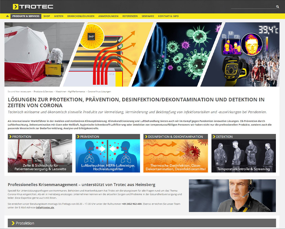 Als international agierendes Unternehmen in der mobilen und stationären Luftbehandlung bieten auch wir im Kampf gegen Pandemien 25-jähriges Know-how eines Marktführers sowie innovative technische Lösungen. Unser innovativer Hochleistungs-Luftreiniger TAC V+ schützt bereits viele Händler und Branchen vor den Gefahren einer luftübertragenen Corona-Infektion. Wo das Tragen von Masken nicht möglich ist oder ein zusätzlicher Schutz vor infektiösen Aerosolen notwendig wird, sorgt der Hochleistungs-Luftreiniger für eine saubere und virenfreie Atemluft.