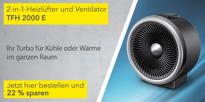 Das moderne 2-in-1-Wunder TFH 2000 E von Trotec. Das Multitalent vereint in seinem modernen Designgehäuse gleich zwei Geräte zur Erzeugung eines angenehmen Ganzjahres-Wohlfühlklimas: einmal die erfrischende Ventilation mit Turbospin-Technologie. Und zum zweiten einen Heizlüfter mit Turbospin-Technologie. Eskalieren demnächst also die Temperaturen, halten Sie die Hitze mit diesem Spitzenventilator und Ihrem Klimagerät schön auf Abstand. Und nach der Sommersaison, an kühler werdenden Abenden und vor allem im nächsten Winter – und auch der kommt – genießen Sie die kuschelige Wärme.