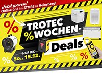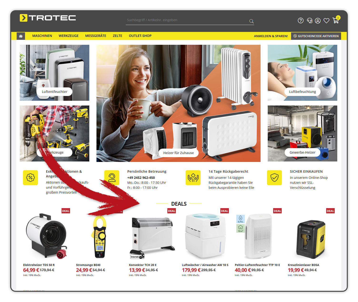 SO FINDEN SIE IHRE DEALS IM ONLINE-SHOP:Auf unserer Startseite im Online-Shop de.trotec.com/shop werden Ihnen alle „TOP DEALS“ angezeigt. Navigieren Sie einfach mit den Pfeilen nach „rechts“ und „links“ und Sie finden alle aktuellen Deals. |