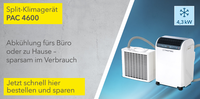 Dann schlagen Sie jetzt zu! Das Split-Klimagerät PAC 4600 ist aktuell besonders günstig im Trotec-Online-Shop erhältlich. Heute bestellt. Schon morgen unterwegs zu Ihnen. So geht schnelle Abkühlung „made in Germany“ und „made by Trotec“.