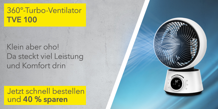 Profitieren Sie von der Trotec-Markenqualität als Garant für hohe Wertigkeit, Sicherheit und Funktionalität. Bestellen Sie am besten noch heute den 360°-Turbo-Ventilator TVE 100 zu unserem aktuellen Angebotspreis statt für 149,94 € für nur 89,95 € inkl. MwSt. – jetzt im Trotec-Shop!