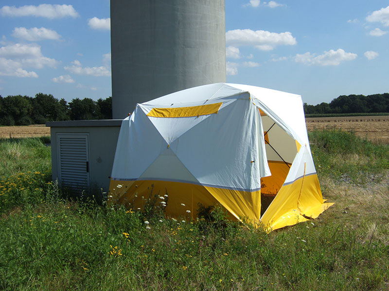 Bei den hier dokumentierten Wartungsarbeiten einer Firma an der Trafostation einer Windkraftanlage kam das Trotec Montagezelt 300 KE zum Einsatz. Das Arbeitszelt mit einem Grundriss von 3,0 m x 3,0 m konnte durch nur zwei Personen in wenigen Minuten aufgebaut werden. Um die Arbeiten effektiv zu schützen, schob man das Arbeitszelt ein Stück über die Trafostation und öffnete das gegenüberliegende Ende zum freien Zugang.