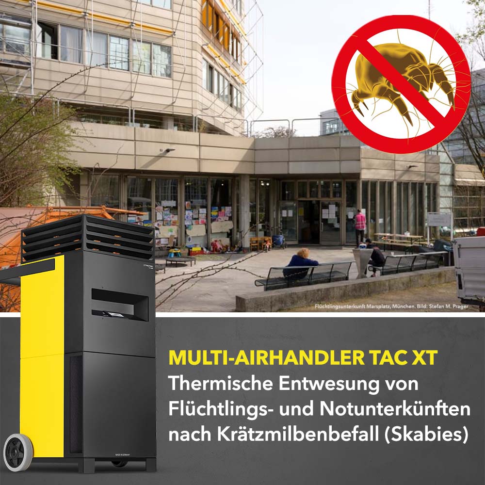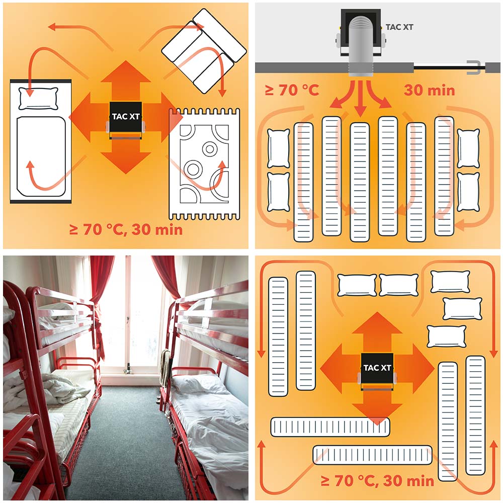 Ist der Airhandler TAC XT einmal im Raum aufgestellt und eingeschaltet, ist für die großflächige Entwesung aller im Raum befindlichen Oberflächen und Gegenstände kein weiteres Personal erforderlich. Die Abtötung aller Schädlinge im menschenleeren Raum erfolgt vollautomatisch durch die Hitzebehandlung des TAC XT. Die Behandlung in Flüchtlingsunterkünften, Notunterkünften und vergleichbaren Einrichtungen kann sowohl vorbeugend als auch bei akutem Befall erfolgen.