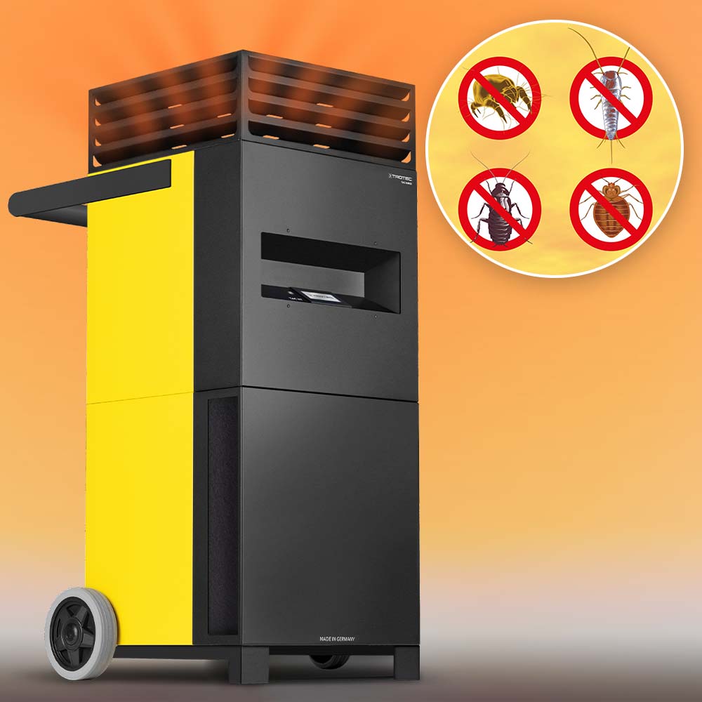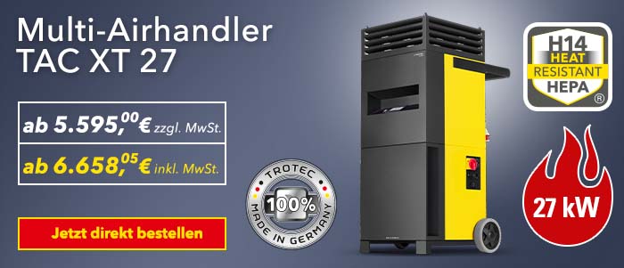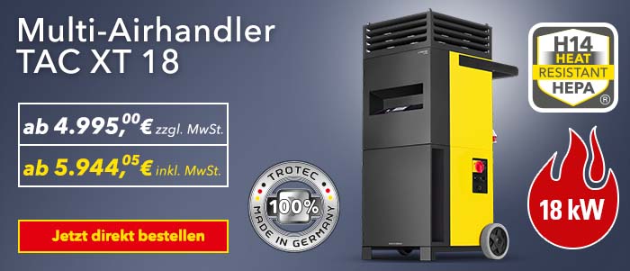 Mit dem Multi-Airhandler TAC XT gibt Trotec Kommunen, Hilfsorganisationen aber auch Unternehmen in der Schädlingsbekämpfung eine transportable Mobileinheit zur thermischen Entwesung von Räumen und Inventar an die Hand. Während herkömmliche Thermodesinfektoren zumeist stationär verbaut werden und somit nur ortsgebunden zum Einsatz kommen, überzeugt der TAC XT mit einer hohen Einsatzflexibilität. Der Multi-Airhandler TAC XT ist die erste mobil verwendbare Lösung zur professionellen thermischen Raumdekontamination mit integrierter H14-HEPA-Luftfilterung auf dem Markt. Damit empfiehlt sich der TAC XT sowohl zur thermischen Entwesung von Räumen – aber ebenso zur Filterung und Reinhaltung der Raumluft. Ist der Dekontaminationseinsatz in einem Raum abgeschlossen, lässt sich der TAC XT bequem zum nächsten Behandlungsort transportieren.