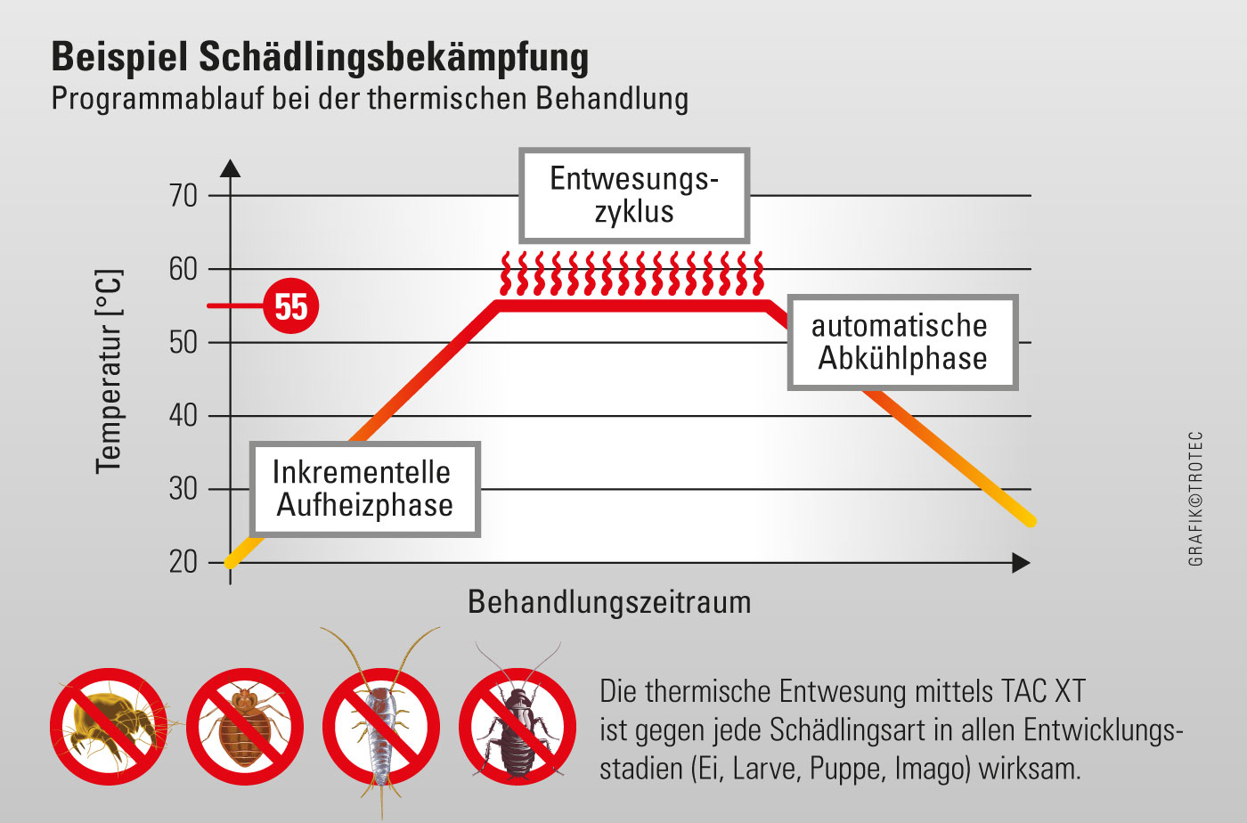 Insbesondere aufgrund der vergleichsweise kurzen Anwendungsdauer und dem Verzicht auf teures Fachpersonal empfiehlt sich die thermische Entwesung mit dem TAC XT daher als äußerst wirtschaftliche und zeitsparende Alternative zur Begasung und Flächenreinigung mit chemischen Produkten.