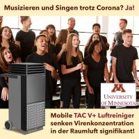 Insbesondere in Musik-Unterrichtsräumen ist eine hohe Luftwechselrate erforderlich, um mit Viren beladene Aerosolgemische effektiv aus der Raumluft zu entfernen. Die Weltgesundheitsorganisation (WHA) empfiehlt eine Frischluftversorgung von mindestens 288 m³/h pro Person im Raum bereitzustellen. Eine solche Belüftungsrate, so die Forscher der Universität Minnesota, sei mit einer natürlichen Belüftung aber möglicherweise nicht zu erzielen. Auch festinstallierte Lüftungsanlagen (RLT-Anlagen) könnten diese Menge an „sauberer Luft“ mitunter nicht gewährleisten. Daher empfehlen die Wissenschaftler in solchen Fällen den Einsatz von mobilen Hochleistungsluftreinigern wie dem TAC V+, um die gewünschten Luftwechselraten auf kontrollierte Art und Weise zu gewährleisten.