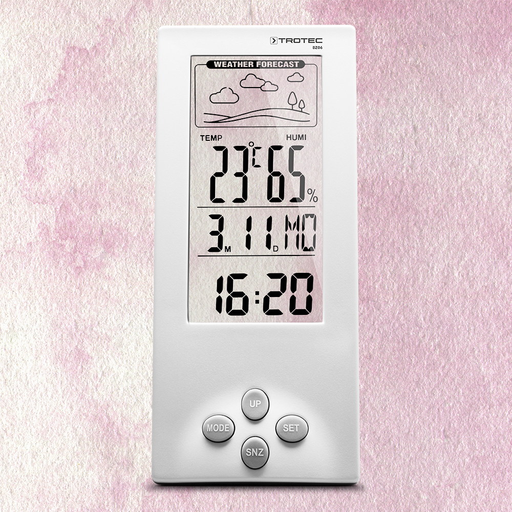 Die passende Temperatur sowie eine optimal regulierte Luftfeuchtigkeit sind maßgebliche Faktoren für ein angenehmes und gesundes Raumklima. Sowohl zu hohe als auch zu niedrige Klimawerte beeinträchtigen spürbar unser Wohlbefinden. Daher lohnt es sich, Temperatur und Luftfeuchte mit dem Thermohygrometer BZ06 stets im Blick zu haben, um sie, je nach individuellem Empfinden, mit einem Luftentfeuchter, Luftbefeuchter oder einer angepassten Heizleistung oder Abkühlung in den optimalen Bereich zu regulieren.