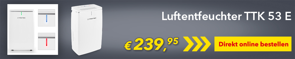 Zur Austrocknung der Wände steht ein mobiler Luftentfeuchter der TTK-Serie mit 30 Litern Entfeuchtungsleistung in 24 Stunden im Keller. „Bautrockner waren nirgendwo mehr zu bekommen“, erklärt Susanne Braun. „Wesentlich mehr Wasser würde aber auch ein Profi-Bautrockner nicht aus den Wänden und Böden ziehen.“, sagt Braun. „Wir haben online geschaut, wo wir noch Komfort-Luftentfeuchter bekommen. Bei Trotec waren die sofort verfügbar, also haben wir das Gerät mit der größten Entfeuchtungsleistung gekauft.“