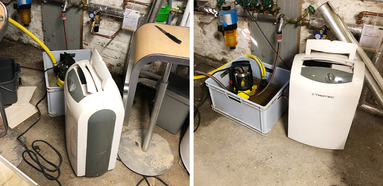 Trocknung: Selbsterdachtes System aus TTK-Luftentfeuchter und TWP-Schmutzwasserpumpe trocknet Wände und Böden