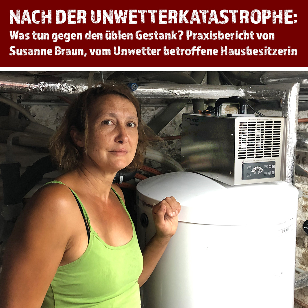 „Es roch modrig und wurde von Tag zu Tag schlimmer“, sagt Susanne Braun naserümpfend. Der Modergeruch und viele andere unangenehme Gerüche entstammen hauptsächlich Stickstoff-, Schwefel- und Kohlenwasserstoffverbindungen, die bei Verdampfungs- und Zersetzungsprozessen entstehen. Hinzu kommt die Fäkalien-Belastung durch den Rückstau aus der Kanalisation. „Die Heizungsanlage, die Wände und der Boden müssen desinfiziert und gereinigt werden. Das übernimmt eine Firma, allerdings dauert das noch ein paar Tage.“, sagt Braun. „Also haben wir uns vorab schon einmal um die Beseitigung des Gestanks gekümmert.“ Beraten wurde das Ehepaar dabei telefonisch von den Trotec-Wasserschaden-Experten. „Das dafür notwendige Gerät haben wir dann direkt telefonisch bestellt und konnten schon einen Tag später mit der Geruchsbeseitigung starten“, sagt Susanne Braun rückblickend.