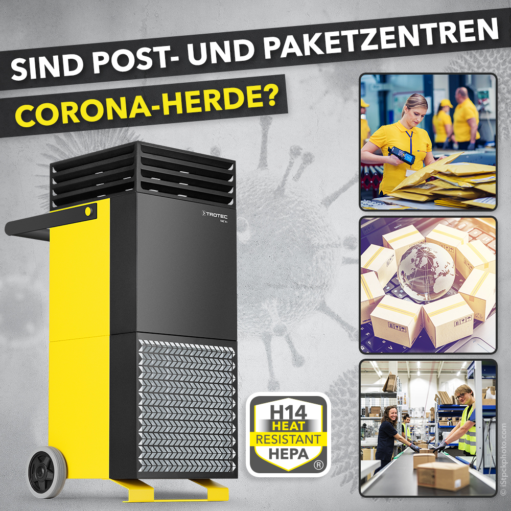 Sichere Arbeitsbereiche in Paketzentren, frei von eventuell infektiösen Aerosolen in der Raum- und Atemluft, schafft der neuartige Hochfrequenz-Luftreiniger TAC V+, den Trotec als Spezialist in der Raumluftfilterung und europaweit führendes Unternehmen in der Entwicklung von Luftreinigungsgeräten unmittelbar nach Bekanntwerden der ersten Corona-Infektionen in Heinsberg entwickelt hat. Der mobile und mit einem speziellen HEPA-Schwebstofffilter ausgestattete Hochfrequenz-Luftreiniger TAC V+ schützt Personen in geschlossenen Räumen vor der mittlerweile auch vom Robert-Koch-Institut bestätigten Ansteckungsgefahr über die Raumluft¹. Denn nicht die Kontaktinfektion beispielsweise über kontaminierte Pakete ist die größte Infektionsgefahr in der Paketlogistik. Auch nicht die Tröpfcheninfektion – davor schützen die mittlerweile europaweit geltenden Abstandsregeln. Nur rund 10 Prozent der Corona-Infektion erfolgen über den direkten Kontakt. Die Hälfte aller Infektionen ist hingegen auf die Einatmung infektiöser Aerosole zurückzuführen, die in geschlossenen Räumen unsichtbar über mehrere Stunden in der Raumluft schweben.