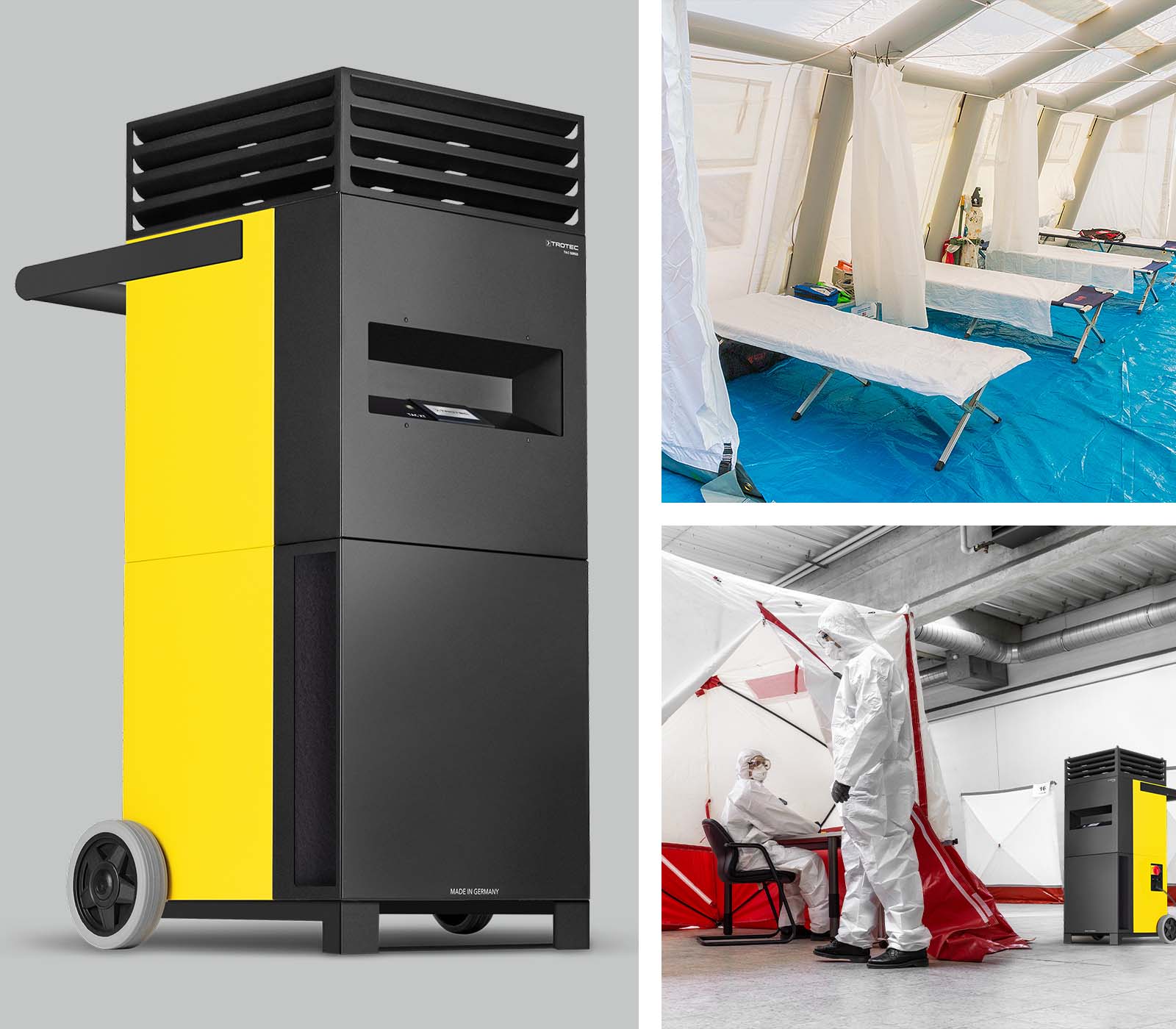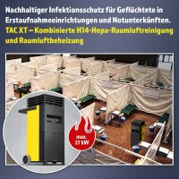 Als mobiler Hochleitungsluftreiniger zeichnet sich der TAC XT durch einen Abscheidegrad von 99,995 % bei Partikelgrößen von 0,1 bis 0,2 µm aus und ermöglicht so eine effektive Bakterien- und Virenfilterung der Raumluft in Flüchtlingsunterkünften. Zusätzlich versorgt der thermostatgesteuerte TAC XT als „Ausgleichsheizer“ die Umgebungsluft mit zugfreier Wärme und kann auf diese Weise vorhandene Heizanlagen ergänzen oder autonom zur Beheizung selbst größerer Räume und Zelte verwendet werden. Mit 18 kW Heizleistung (optional 27 kW), einer mehrstufig regelbaren Luftleistung bis 2.500 m³ und einer flexibel einstellbaren Ausblastemperatur bis 75 °C stellt der TAC XT eine einzigartige Lösung für den flexiblen Einsatz in temporären Aufnahmestellen für Geflüchtete dar.
