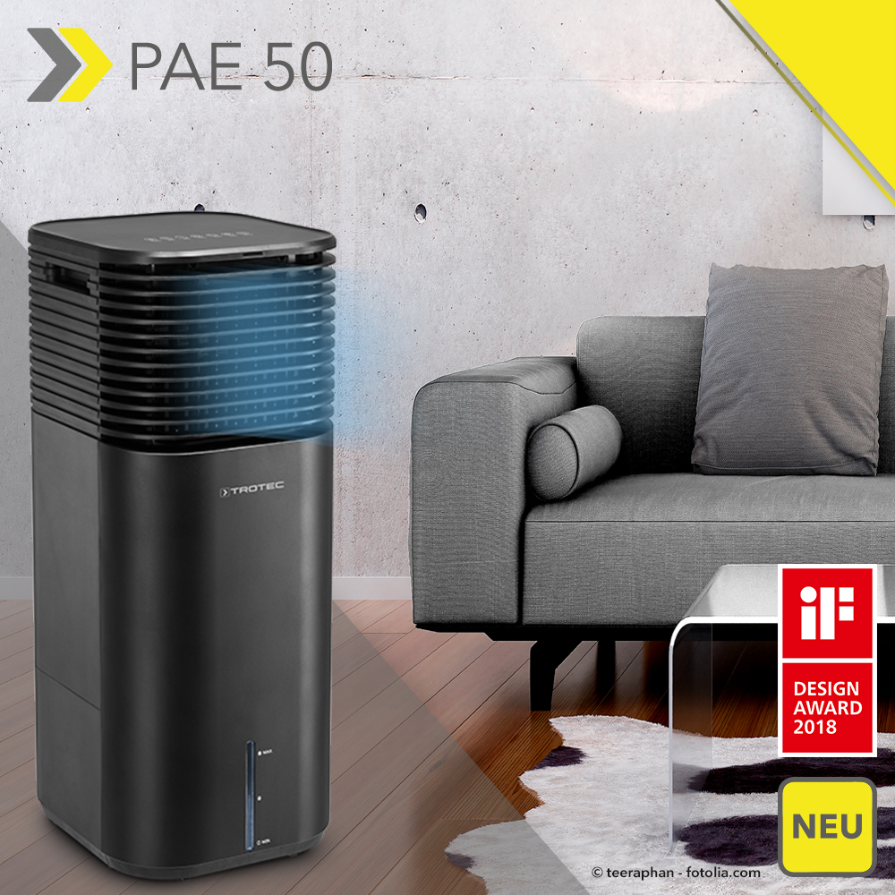 Der neue Aircooler PAE 50 von Trotec ist Träger des IF Design Award 2018. Weltweit gehört dieser begehrte Designpreis mit zu den prestigeträchtigsten Auszeichnungen, die für anspruchsvolle Gestaltungsleistungen verliehen werden. Seine Formschönheit und seine mattschwarze Gehäusefarbe verleihen dem 4-in-1-Luftkühler eine ausdrucksstarke Präsenz im Raum. Doch der Aircooler gewinnt nicht nur durch sein preisgekröntes Design, sondern überzeugt ebenso auch bei Funktion und Leistung.