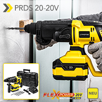 Der nur 3 Kilo leichte Akku-Bohrhammer PRDS 20-20V steht für mobile Schlagkraft mit hammerharten Ergebnissen. Kabellose Einsatzfreiheit beim Bohren, Hammerbohren und Schrauben ermöglicht das Kraftpaket dabei mit seinem 20 V 4 Ah starken Lithium-Ionen-Akku der Flexpower-Multiakku-Serie. Und Profis wissen: Je weicher der Werkstoff, desto höher die benötigte Drehzahl. Daher ermöglicht die stufenlose Drehzahl- und Schlagsteuerung des Akku-Bohrhammers eine optimale Anpassung der Schlag- und Drehzahlfrequenz an den Härtegrad des zu bearbeitenden Materials.