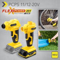 Akku-Kompressor PCPS 11 20V, Akku-Luftpumpe PCPS 12-20V, Schnell-Ladegerät, auswechselbarer Flexpower-Multiakku (20 V, 2 Ah), Einsatzkoffer und zehnteiliges Zubehör-paket, bestehend aus drei Luftpumpen-Düsenaufsätzen in verschiedenen Größen, Kompressor-Druckluftschlauch mit Gewindeanschluss, Adapter für Dunlop- und Sclaverandventil, Ballnadel, zwei kurzen Universaladaptern und einem langen Universaladapter.