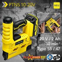 Im Komplett-Paket enthalten sind neben dem Akku-Tacker PTNS 10-20V ein teilgeladener Flexpower-Lithium-Ionen-Multiakku (20 V 2 Ah), ein Schnell-Ladegerät (1 h) und 500 x Stahlklammern des Typ 55 (20 mm), 500 x Nägel des Typ 47 (20 mm) sowie ein praktischer Transportkoffer zur staubgeschützten Aufbewahrung im Werkzeugkeller oder Werkzeugschrank.