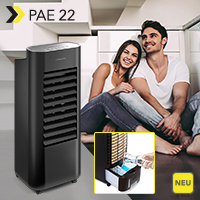 Der PAE 22 erzeugt natürliche Verdunstungskälte per Honeycombfilter-Prinzip. Zum Start müssen Sie lediglich den 6-Liter-Wassertank mit kaltem Leitungswasser befüllen. Den Abkühlungseffekt können Sie noch verstärken, indem Sie zusätzlich die 2 im Lieferumfang enthaltenen Kühlakkus in den Wassertank einlegen. Mit einem Luftdurchsatz von 330 m³ pro Stunde und einer Befeuchtungsleistung von 0,9 Liter pro Stunde kann das Gerät mit nur einer Wassertankfüllung gut 6,5 Stunden lang gekühlte Luft abgeben. Bei leerem Wassertank blinkt eine LED auf dem Display.
