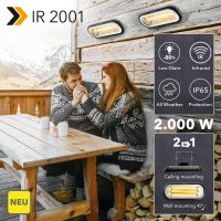 Draußen gibt’s jetzt länger Kännchen. Auf dem Balkon, der Terrasse oder auch im Außenbereich in der Gastronomie. Denn das große Zittern an kühlen Tagen gehört mit dem neuen Design-Infrarot-Heizstrahler IR 2001 der Vergangenheit an. An Wand oder Decke befestigt garantieren satte 2.000 Watt Infrarot-Heizleistung sommerliche Temperaturen ohne Vorheizen. Dabei reduziert die hochwertige Low Glare-Infrarotröhre die Lichtintensität um bis zu 80 %. Und aufgrund des nach Schutzart IP65 konstruierten Gehäuses ist der kompakte Infrarotstrahler zuverlässig vor Wind und Regen geschützt. Da nehmen wir gerne eine weitere volle Pull …, äh Kännchen!