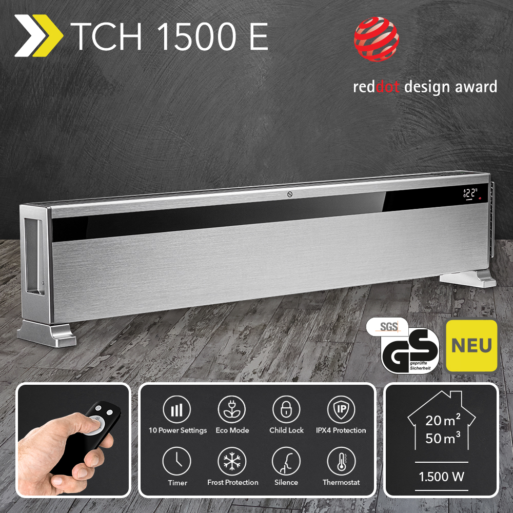 Seit knapp zwei Jahrzehnten adelt der renommierte Red Dot Design Award, verliehen vom Design Zentrum Nordrhein Westfalen, Entwürfe und Objekte von hoher Gestaltungsqualität. So wie unseren neuen Design-Konvektor TCH 1500 E. Hochwertig in seinem Aluminiumgehäuse. Edel mit gebürsteter Frontblende. Elegant seine schwarze Hochglanz-Zierleiste! Dazu überzeugt der stilvolle Konvektor auch in puncto Heizleistung und Komfort. Eigentlich zu schade für den schnöden Verkauf! Oder vielleicht an ausgewiesene Design-Liebhaber …?!