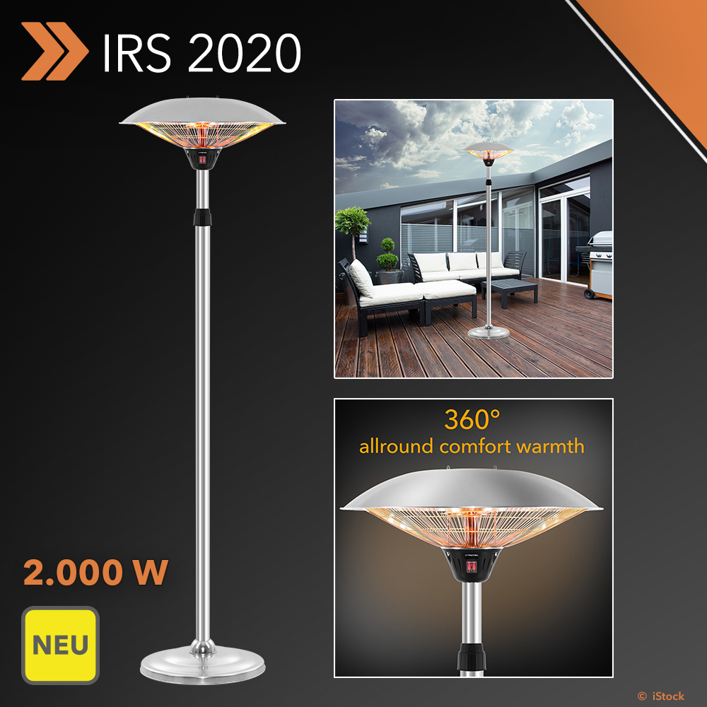 Die gelungene Kombination aus hochwertigem Aluminium und rostfreiem Edelstahl macht den Design-Standheizstrahler IRS 2020 sowohl zu einer praktischen wie optisch besonders attraktiven Heizlösung. Die flexibel einsetzbare Wärmequelle spendet mittels der beiden integrierten jeweils 1.000 Watt starken Halogen-Infrarotröhren ohne Vorheizzeit eine in alle Richtungen gleichmäßige Rundumwärme – und ermöglicht somit die ganzjährige Nutzung der überdachten Terrasse gerade auch von Gastronomiebetrieben. Dazu passt sich das stilvolle Design des hochwertigen Heizstrahlers perfekt in jedes Ambiente ein: der pilzförmige Reflektor und der Standfuß sind aus matt schimmerndem Aluminium gefertigt und die höhenverstellbare Teleskopstange besteht aus rostfreiem Edelstahl.