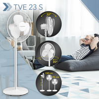 Endlich und rechtzeitig, bevor die Tage deutlich wärmer werden, ist der neue Design-Standventilator TVE 23 S lieferbar. Dank seines klassisch elegant-weißen Designs bringt er zwar von vornherein eine gesunde Grundkühle mit, aber die wirklich erfrischende Abkühlung kommt doch durch das Zusammenspiel der überzeugenden technischen Features: 50 Watt versprechen eine eisbärenstarke Leistung, 3 Geschwindigkeitsstufen ein cooles Erlebnis und 2 Größenvarianten einen perfekt angepassten Luftstrom.