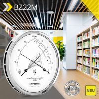 Das in höchstem Maße wertig anmutende Thermohygrometer im robusten Edelstahl-Gehäuse (Ø 130 mm) ermöglicht es dank seines speziellen Ziffernblatt-Designs, alle relevanten Klimawerte leicht verständlich und selbst auf größere Entfernung gut abzulesen. Wo andere Wohnklima-Messgeräte eine Vielzahl von Zeigern und Skalen benötigen, punktet BZ22M mit seinem einzigartigen Kreuzzeiger-Design und vereint so klassische Messtechnik mit einer innovativen Anzeige der gemessenen Raumklimawerte. Wo auch immer das Haarhygrometer mit Thermometer zum Einsatz kommt – es zieht die Blicke auf sich.