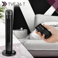 Anders als bei Ventilatoren mit Rotoren wird der Luftstrom bei dem TVE 36 T durch eine Lamellenkonstruktion erzeugt, die sich im Inneren des Gerätes dreht. Die vertikal ausgerichtete Achse ermöglicht dabei die platzsparende Konstruktion. Da der Luftausstoß über die gesamte Gerätehöhe erfolgt, kommt es zu einem gleichmäßigen, breiten Luftstrom, der spürbar intensivere Abkühlung liefert.