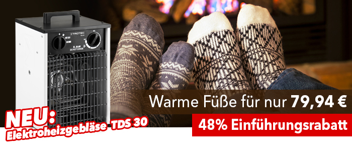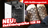 Das Warten hat sich gelohnt! Die optimale Wärmelösung, der neue TDS 30, ist jetzt lieferbar. Das Elektroheizgebläse erzeugt seine Wärme völlig kondensfrei: also ohne Verbrauch von Sauerstoff oder dem Erzeugen von Verbrennungsabgasen. Daher kann das Gerät praktisch in allen Innenräumen zur Beheizung eingesetzt werden – etwa in Baucontainern, Bootsschuppen, Werkstätten, Lager- und Arbeitshallen. Und das Beste: das Heizgebläse lässt sich flexibel auch an der Wand oder Decke anbringen.