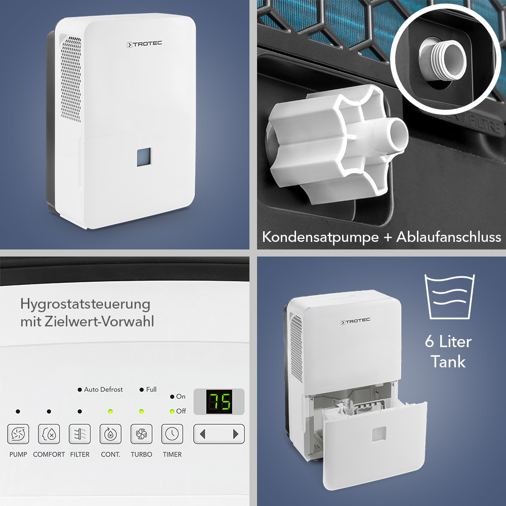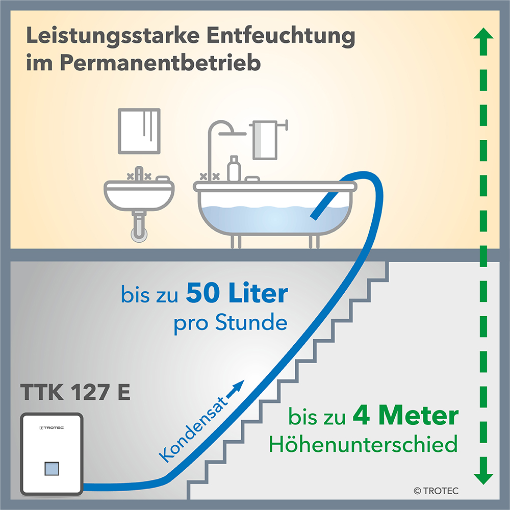 Wer größere Mengen Feuchtigkeit aus Räumen mittels eines Luftentfeuchters entfernen muss, weiß um das ständige Entleeren müssen des Wasserbehälters. Doch damit ist nun Schluss – sofern Sie auf den professionellen Komfort-Luftentfeuchter TTK 127 E von Trotec setzen: Denn dieses Kraftpaket, das Ihnen am Tag bis zu 50 Liter Feuchtigkeit auswringt, erhalten Sie jetzt mit einer zusätzlich eingebauten leistungsstarken Kondensatpumpe. Und mit deren Hilfe können Sie das angesammelte Wasser automatisch ableiten. Bis zu 50 Liter Wasser pro 24 Stunden! Ganz einfach auf Knopfdruck!