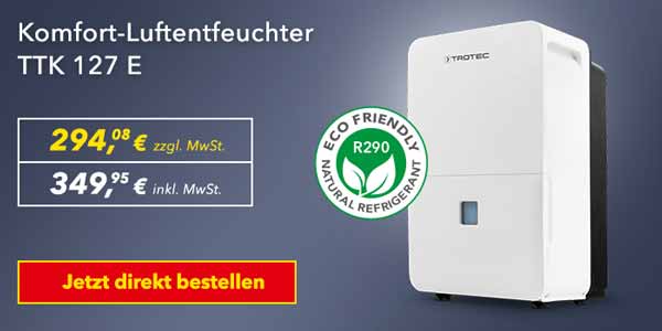 Profitieren Sie von der Trotec-Markenqualität als Garant für hohe Wertigkeit, Sicherheit und Funktionalität. Bestellen Sie am besten noch heute den neuen Komfort-Luftentfeuchter TTK 127 E zu unserem aktuellen Angebotspreis statt für 429,95 € (inkl. MwSt.) für nur 349,95 € (inkl. MwSt.) – jetzt im Trotec-Shop!