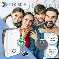 Wenn im Sommer die schwül-feuchte Luft in Wohn- und Büroräume eindringen will, schlägt die Stunde des Luftentfeuchters TTK 60 E. Ausgerüstet mit automatischer Hygrostatsteuerung und starker Leistung, ausgestattet mit einem hohen Anwenderkomfort und elegantem Design stellt er sich der muffigen Luftfeuchte und deren Kumpanen, den fiesen Schimmelpilzen, entgegen. Und hält Ihre Wohn- und Büroräume zuverlässig trocken. Ist es nicht gut, dass dieser starke, gutaussehende und dazu ausgesprochen günstige Partner gerade jetzt zu Ihrer Verfügung steht?