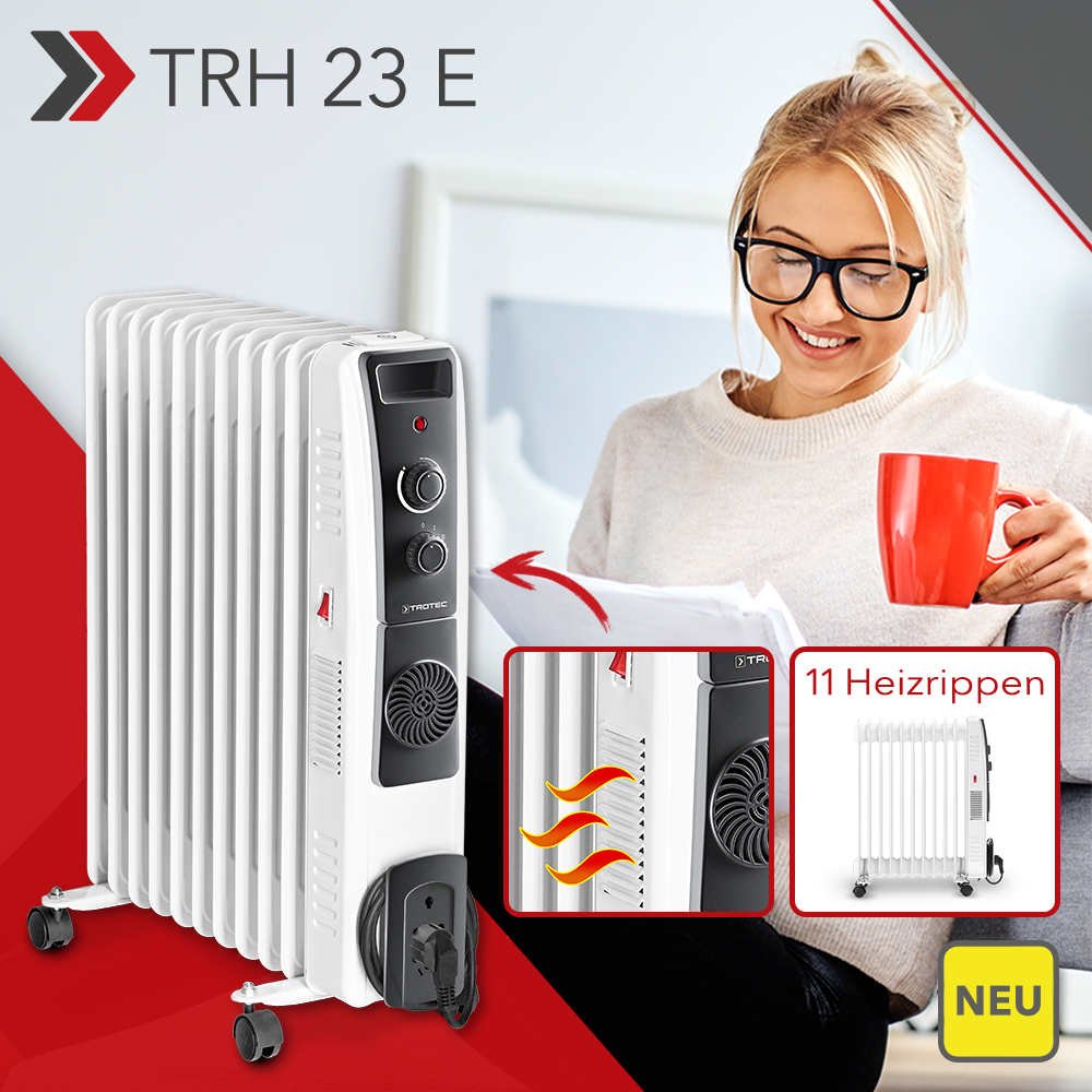 Wer durchgefroren von draußen nach Hause kommt, will’s möglichst schnell kuschelig warm haben. Genau deshalb ist der neue und endlich lieferbare Ölradiator TRH 23 E mit einem keramischen PTC-Heizelement zur schnelleren Erstaufheizung ausgerüstet plus einem zuschaltbaren Turbogebläse. Beides zusammen garantiert die superschnelle Erwärmung der Raumluft – lange bevor das Thermo-Öl seine volle Heizleistung erreicht. Das Beste: dank des thermostatgesteuerten Automatikbetriebs ist der Energieverbrauch erfreulich gering.