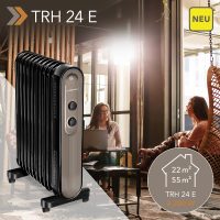 SCHÖNER: Der neue Ölradiator TRH 24 E macht eine überaus gute Figur, denn er rollt stilvoll im eleganten schwarzen Anzug bei Ihnen vor. GÜNSTIGER: Genießen Sie ruhig die wohlig warmen Temperaturen – der TRH 24 E regelt die Heizleistung und den Energieverbrauch mit seiner intelligenten Wärmeautomatik. Damit ist das Überheizen des Raumes ausgeschlossen und Sie verheizen keine unnötigen Energiekosten. LÄNGER: Das im Radiator verwendete Thermoöl ist ein hervorragender Wärmeenergiespeicher, sodass Sie selbst nach dem Abschalten des Heizgerätes noch bis zu 30 Minuten mit einer anhaltenden Wärmeleistung verwöhnt werden.