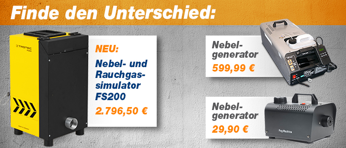 Und exakt für solche und ähnliche Anwendungen ist das Nachfolgemodell des FS100 gedacht – der in Kürze im typischen Trotec Design lieferbare neue FS200. Dieser professionelle Nebel- und Rauchgassimulator aus deutscher Qualitätsfertigung ist das kompakteste und leichteste Gerät in seiner Leistungsklasse. Ein Grund dafür ist die extrem raumsparende Anordnung des Verneblers, der leistungsstarken Turbine sowie der benötigten Steuereinheit zur harmonischen Interaktion von Vernebler und Turbine – dies alles macht den Preisunterschied der „Billig“-Vernebler zu unseren Profi-Aggregaten aus.